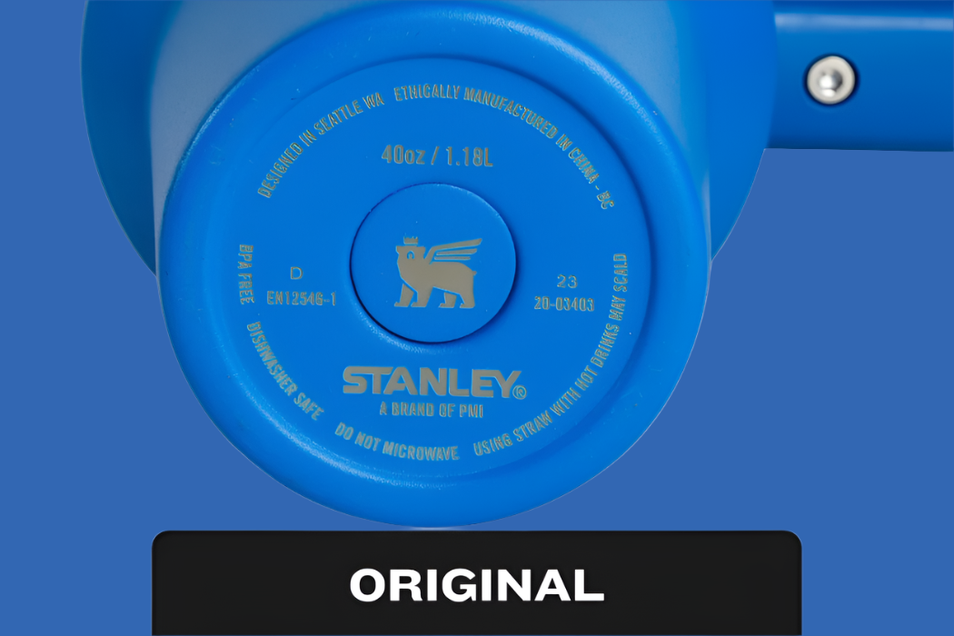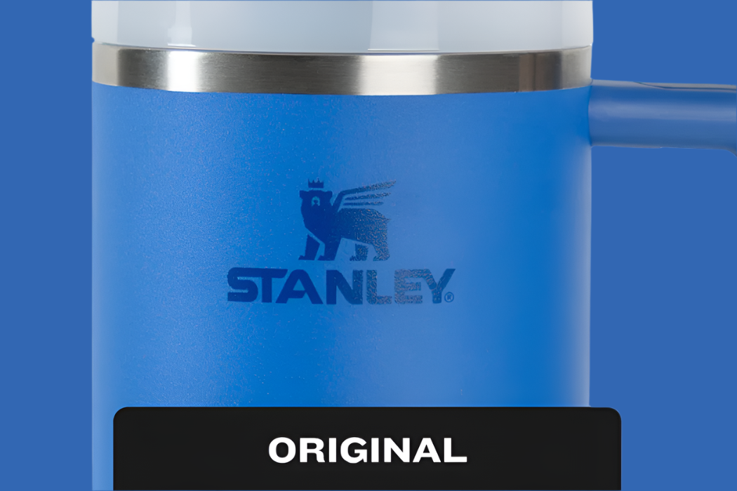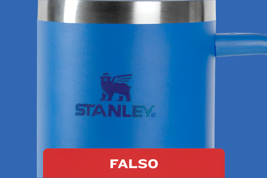 El Stanley original se distingue por un logotipo con bordes nítidos, colores bien definidos y siempre colocado a unos 2 cm del borde de metal. Las versiones faIsas, en cambio, suelen tener logotipos borrosos, con colores deslavados y detalles poco precisos.
